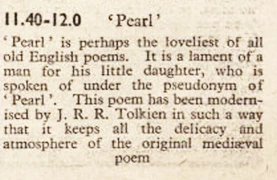 The BBC broadcast of Pearl on Friday, August 7, 1936, at 23:40 (11:40 PM) on the Regional Programme London was the first event in J.R.R. Tolkien’s broadcasting history. He appeared again later in 1938 for a program titled Poetry Will Out, where he discussed Anglo-Saxon verse.