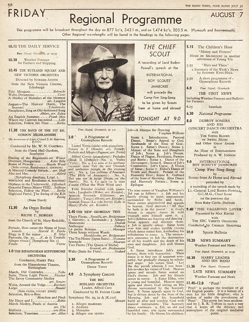 This broadcast reflected his career-long effort to make medieval literature accessible to a modern audience through careful translation. The late-night segment followed several notable broadcasts that evening, including a speech by Lord Baden-Powell (founder of the Scout movement) recorded at an International Jamboree in Durham. Given his and Hilary’s strong connections with the Scouting movement, it’s entirely likely he tuned in that evening to hear his own work being read.