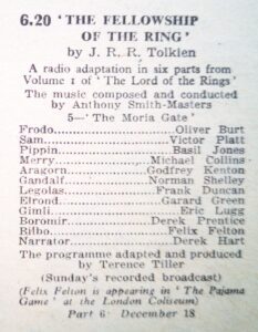 This series had been intended to be the first of three, mirroring the published volumes, But on January 20th 1956, Tiller received a letter from The Deputy Head of the Third Programme, Christopher Holme, informing him that the decision had been made to only make one more series. This forced Tiller to compress volumes two and three into a final run of six, thirty minute episodes and was thus entitled The Lord of the Rings.