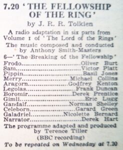 The publication of The Return of the King came in October 1955 and was closely followed by the broadcast of the first episode on November 14th. On the same day, another BBC radio programme, The Critics, reviewed The Lord of the Rings and moved Tolkien to write to Tiller, saying that the programme’s critics “were unbearable, with an air of superiority that only ignorance can maintain.” He also complains about Bilbo and Glóin’s accents and asks for an explanation for the (“appalling“) treatment of Bombadil and his daughter Goldberry, not to mention Old Man Willow who had been described as an ally of Mordor!