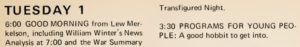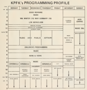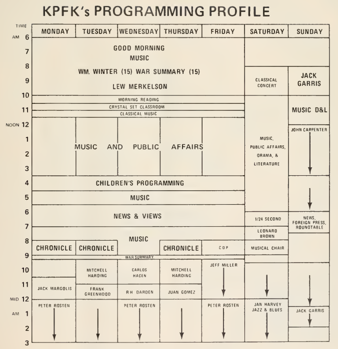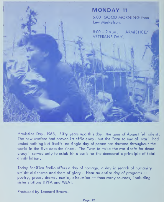KPFK broadcast part of a reel, or a specific chapter-segment, each day as part of the show. This stretched the 22 reels of content across 33 calendar days. Each part went out 1st October 1968 – 15th November 1968 with an exception for 11th November which is Armistice Day and regular programming was suspended.