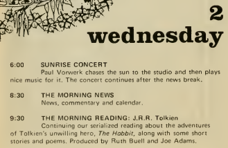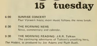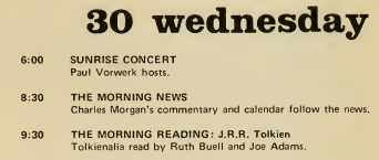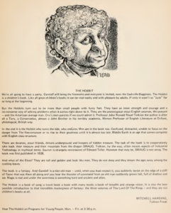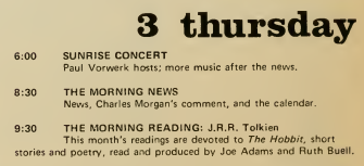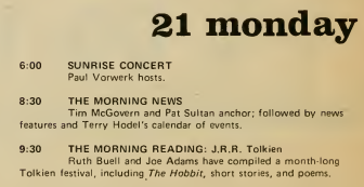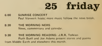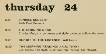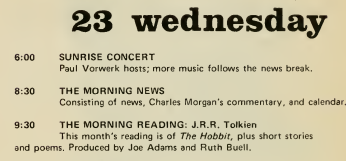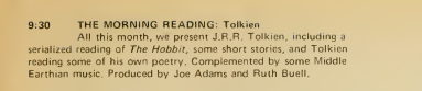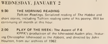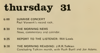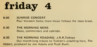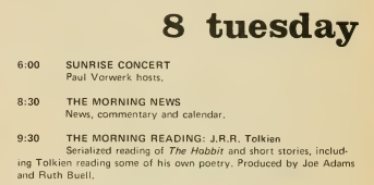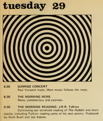 One of the earliest complete American radio readings of The Hobbit, predating the 1973 Mind’s Eye dramatisation. The work consists of 22 master units and a standard 7-inch studio reel at 7.5 ips holds about 24–28 minutes of audio. The tapes are still preserved and referenced as Master Archive ID: Pacifica Radio Archives BB2222.01-.22. Whilst no mention is made in the folio of who the reader was, it has been reported by listeners that it was Harold Innocent and it is confirmed that Innocent was active with the station in October 1968, from the evidence of other listings in that month.