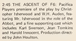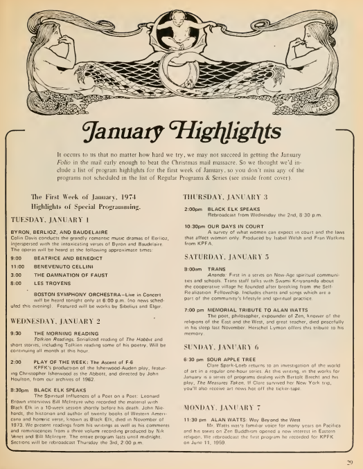 KPFK is a US radio station in Los Angeles, USA which belongs to the community-owned Pacifica Radio Network. KPFK also produced a monthly publication ‘The Folio‘ which listed radio schedules, articles, and listener information, providing insights into the station’s counterculture, social justice, and educational programming. In the late sixties they maintained the Pacifica Players ensemble of actors, allowing them to perform numerous works in-house. One of their number at this time was the noted British actor, Harold Innocent, evidence from listings in the folio.