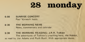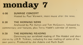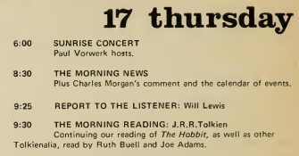 Just a few months after the death of JRR Tolkien, in September 1973, the production was re-serialised in January 1974 for The Morning Read as a month-long Tolkien Memorial, hosted by Ruthie Buell (“Uncle Ruthie”) and Joe Adams. They aired one full master reel per day. A standard 7-inch studio reel at 7.5 ips holds about 24–28 minutes of audio ideal for the 30-minute broadcast slot with room for intro/outro music and any gaps being filled from the Caedmon recordings of Tolkien reading short extracts of his works. By playing a full archival reel each morning, they condensed the 7-week 1968 schedule into a tidy 22-day “Tolkien Month.”