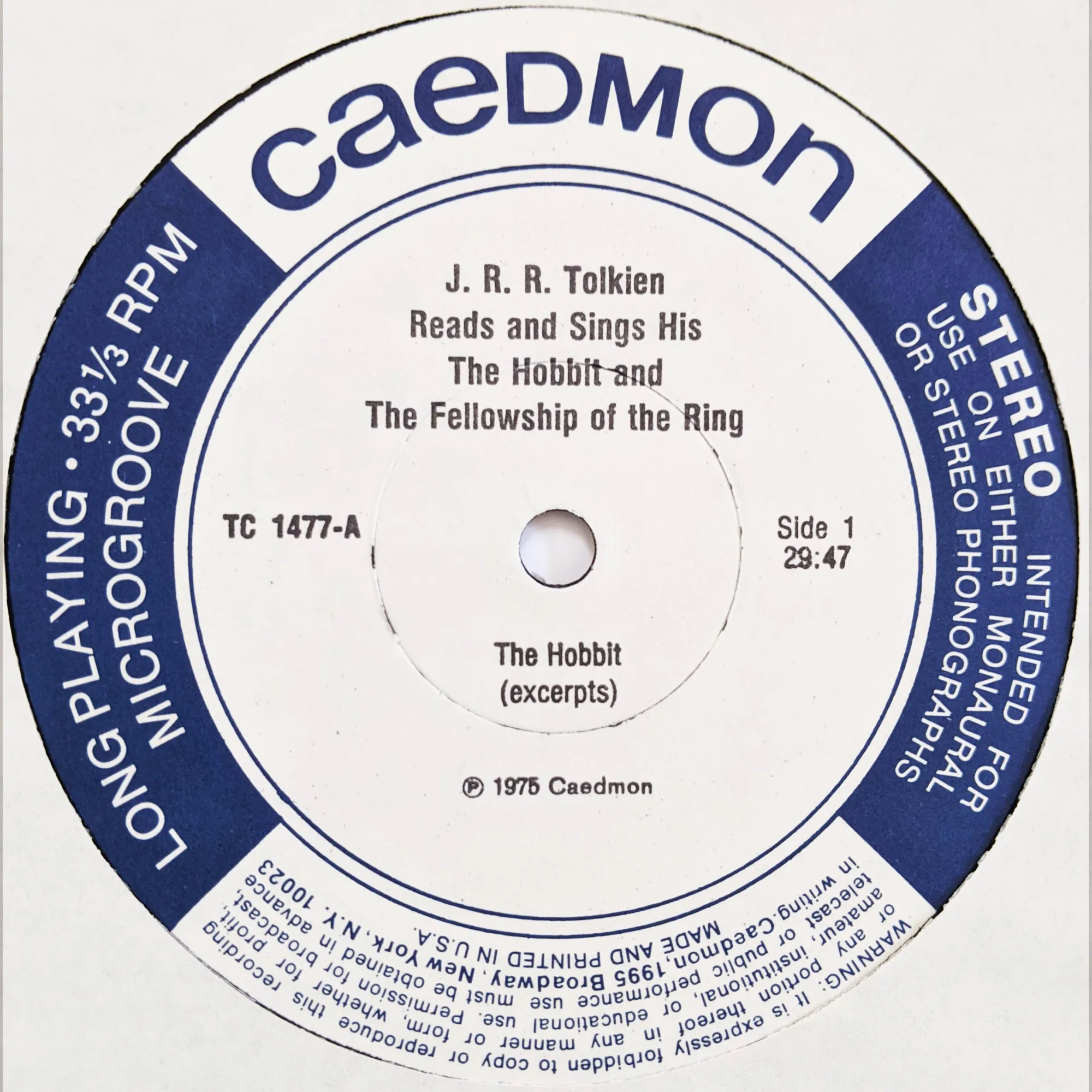 The LP is famous for Tolkien’s “Gollum voice,” which is raspy and distinct, providing the blueprint for many later interpretations. Tragically, Caedmon cut out the Lord’s Prayer in Gothic and the conversational chatter between Tolkien and Sayer.