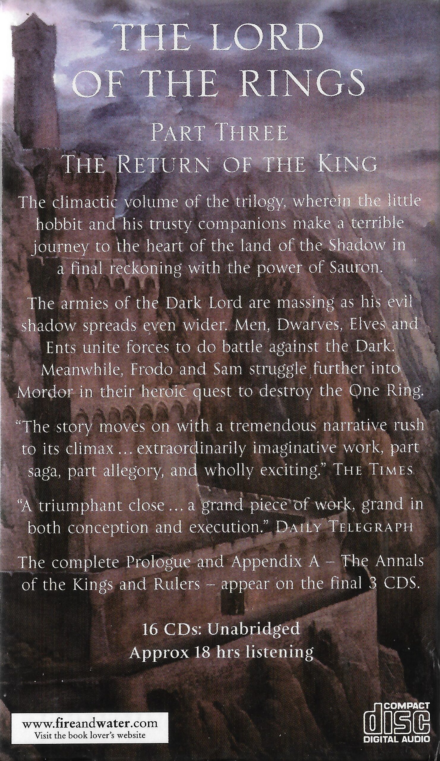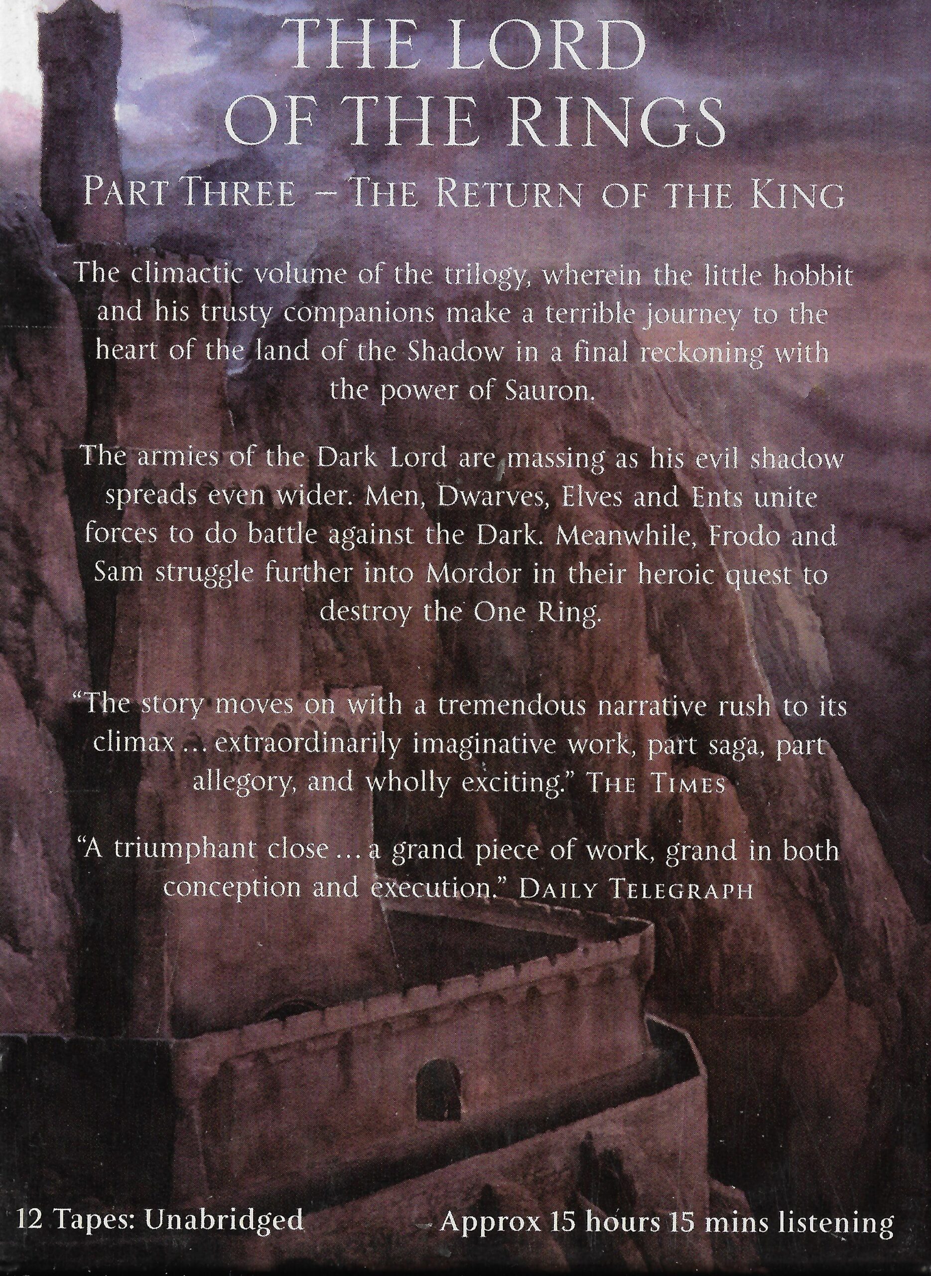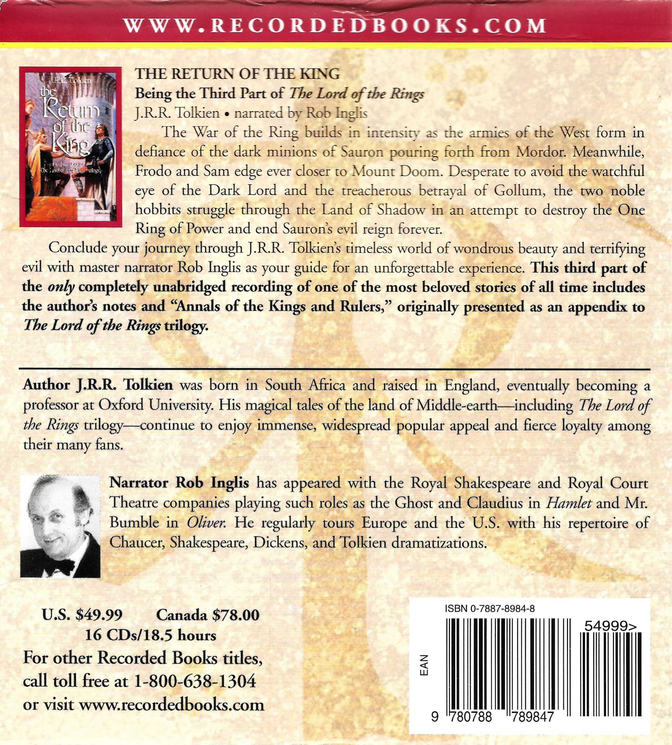 As a result of these acclaimed performances, he was asked to narrate the unabridged audiobook editions of The Lord of the Rings, in 1990 and the following year, The Hobbit.