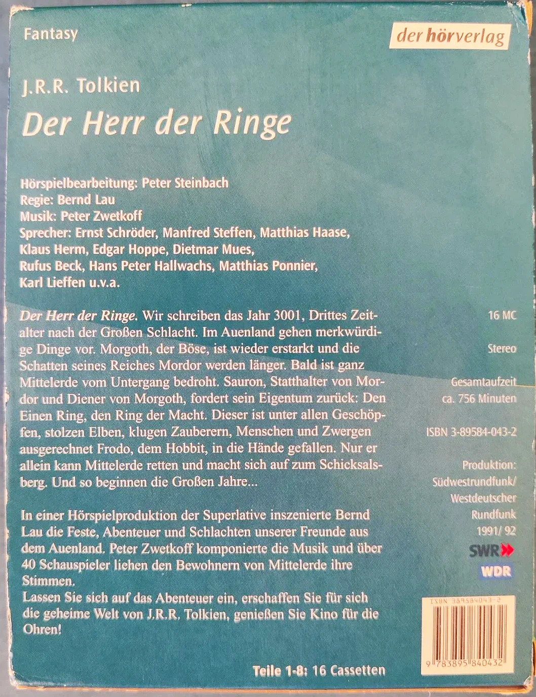 The German radio production of Der Herr der Ringe is a significant piece of audio history, often described as a “theatre for the ears.” Produced between September 1991 and March 1992, it remains the definitive German dramatization of Tolkien’s work. The series was a joint venture between two major public broadcasters: Südwestfunk (SWR) and Westdeutscher Rundfunk (WDR). It first aired on German radio in January 1992 and was released commercially shortly after by Der Hörverlag.