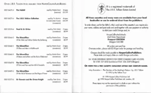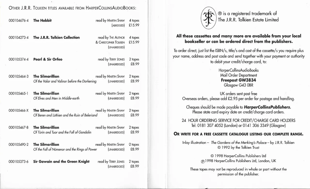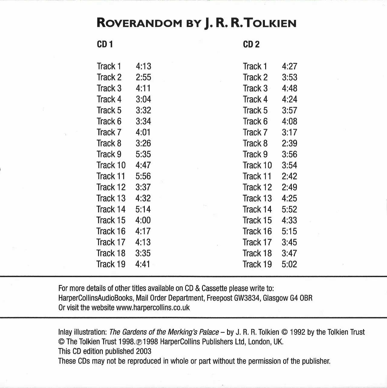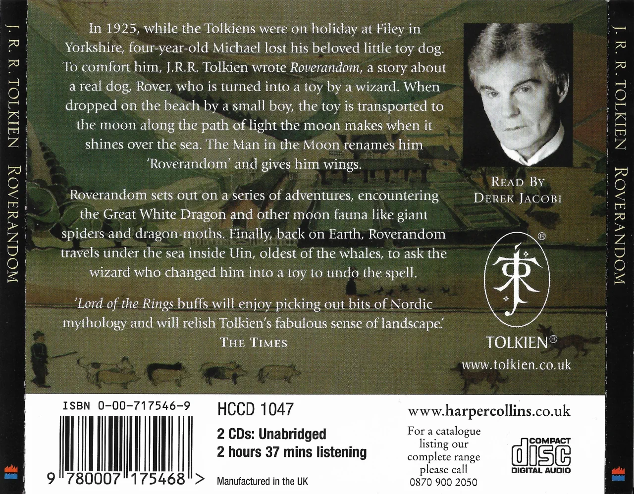 The 1999 cassette inlay features J.R.R. Tolkien’s own illustration: The Gardens of the Merking’s Palace (see image gallery above). This blue-and-green artwork became the “face” of the Roverandom audio brand for over a decade.
