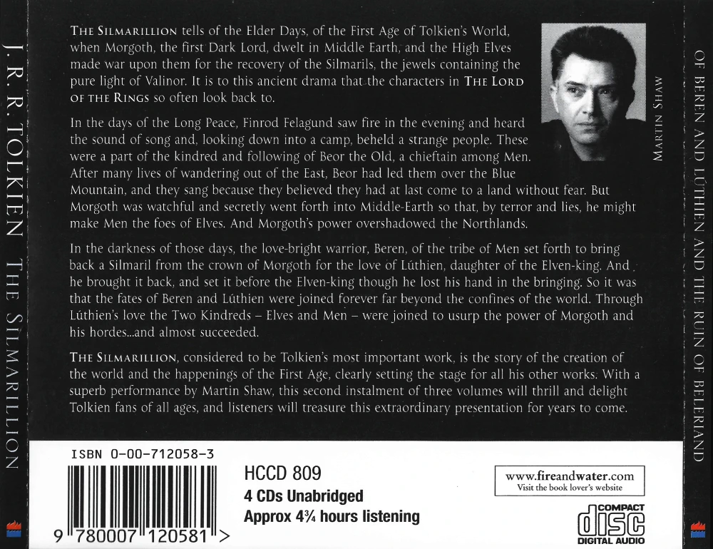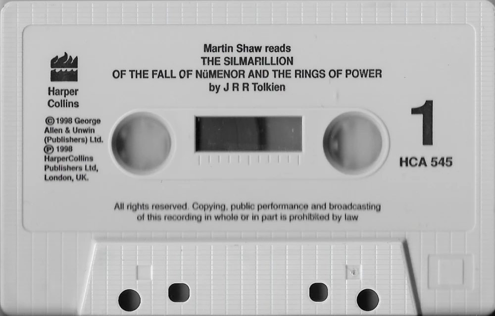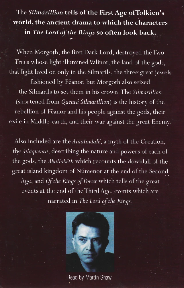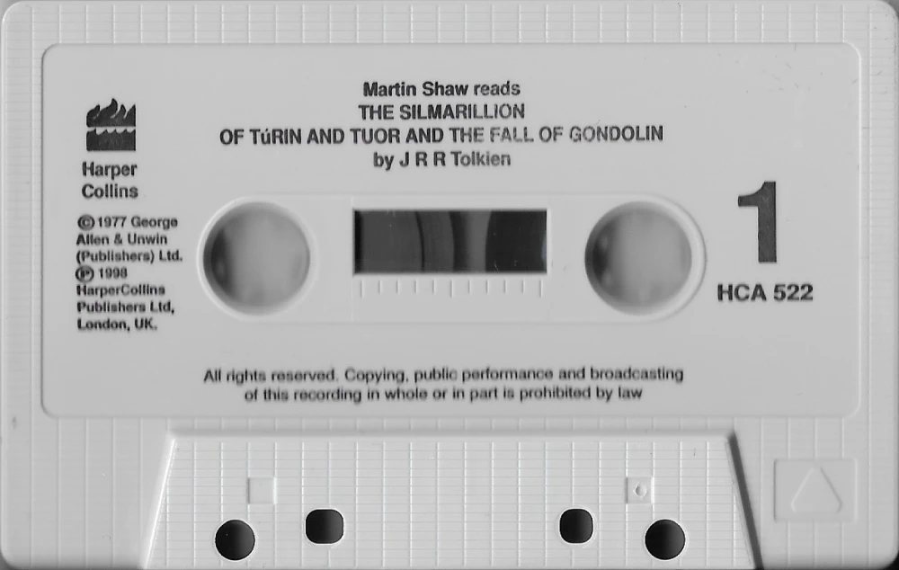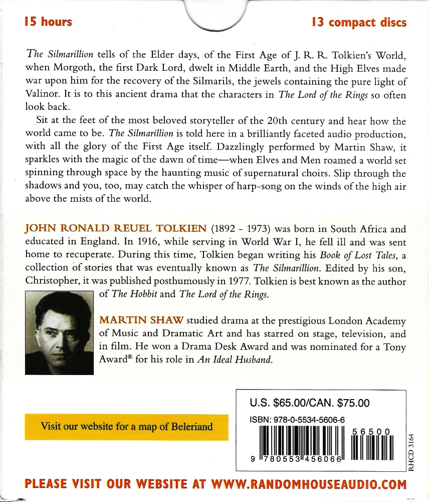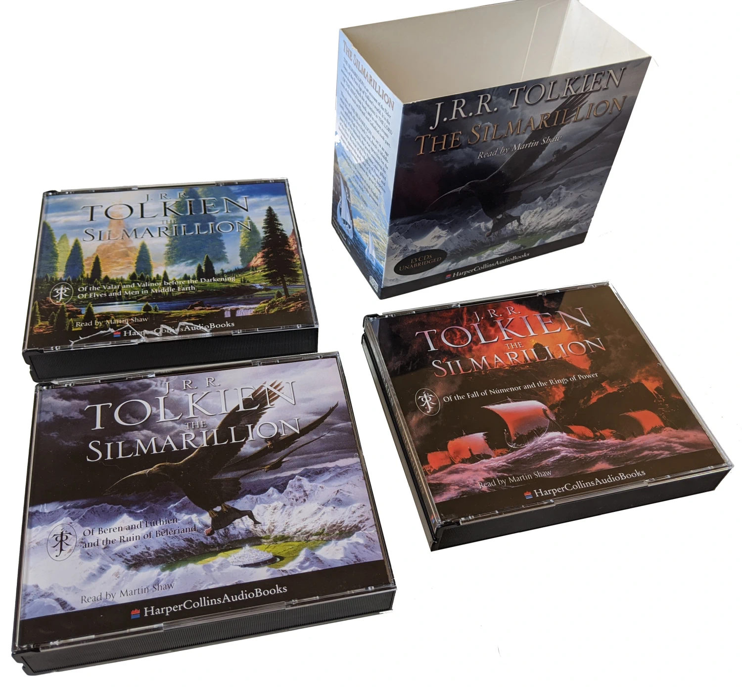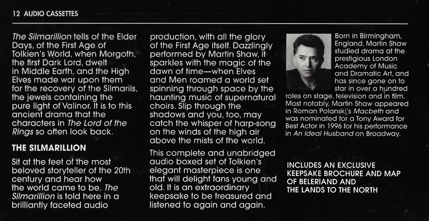 The 1998 recording of The Silmarillion by Martin Shaw was a landmark production that served as the primary English audio version of the text for 25 years. The production was a collaboration between HarperCollins (UK) and Random House Audio/BDD Audio (US). It was first released as a multi-volume set of 12 cassettes that included a brochure and a map of Beleriand and also as a 13 CD box set.