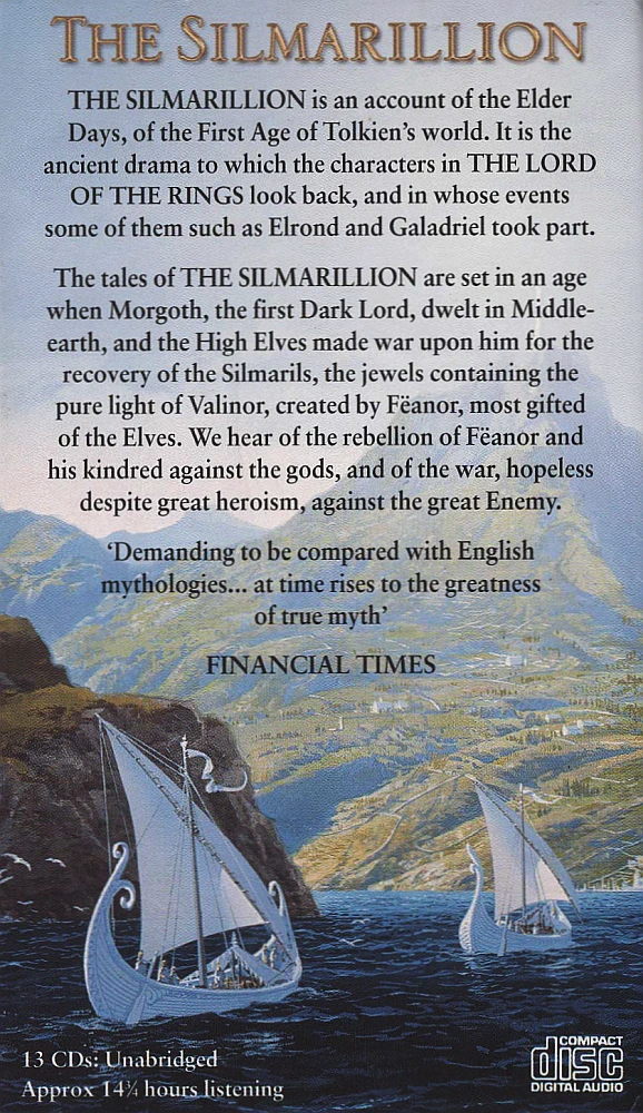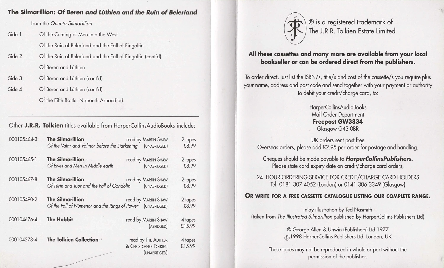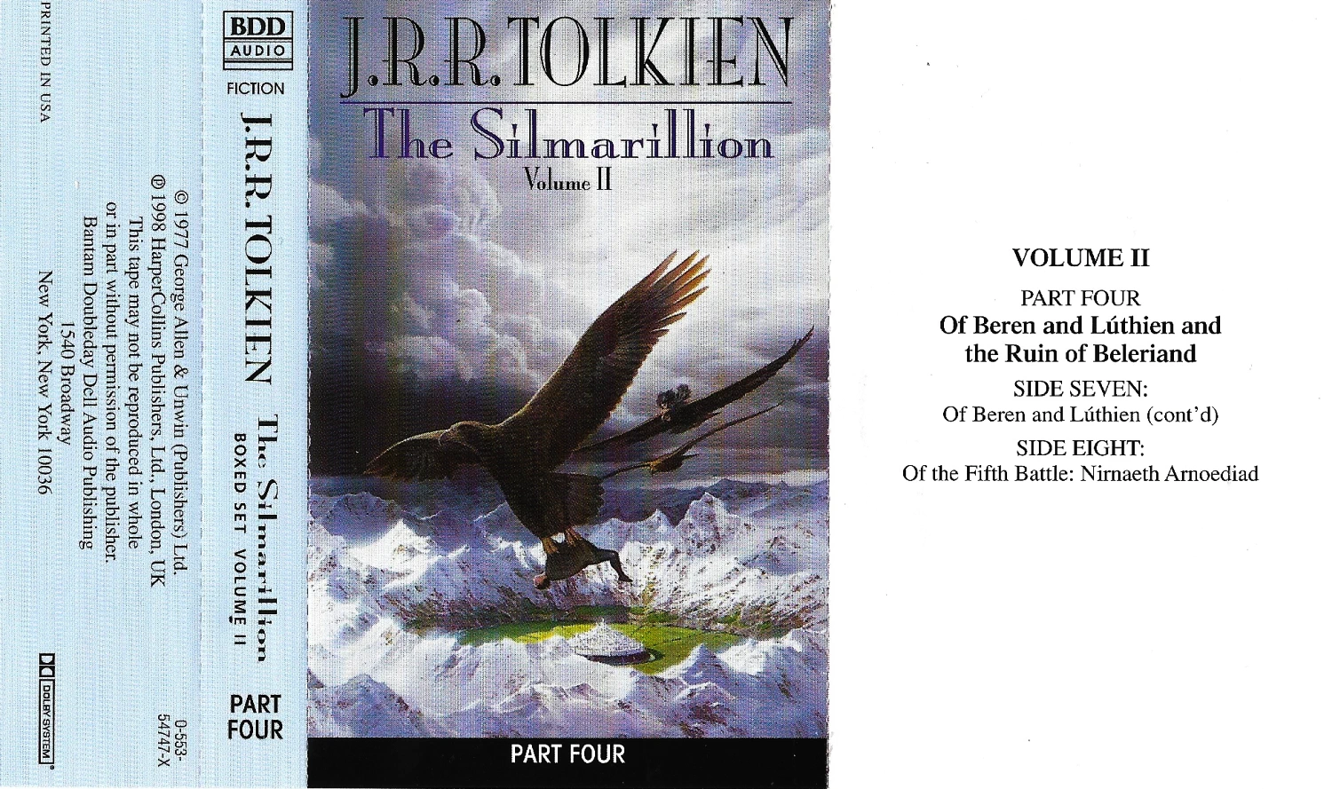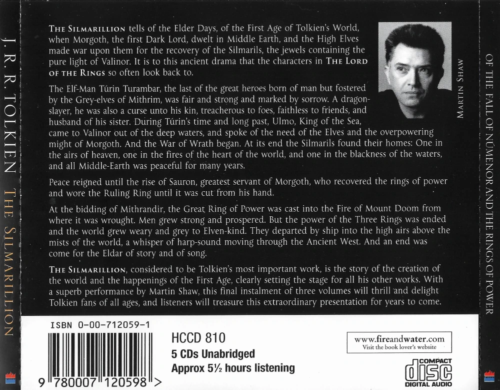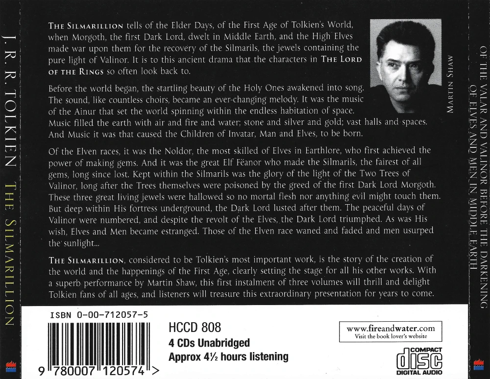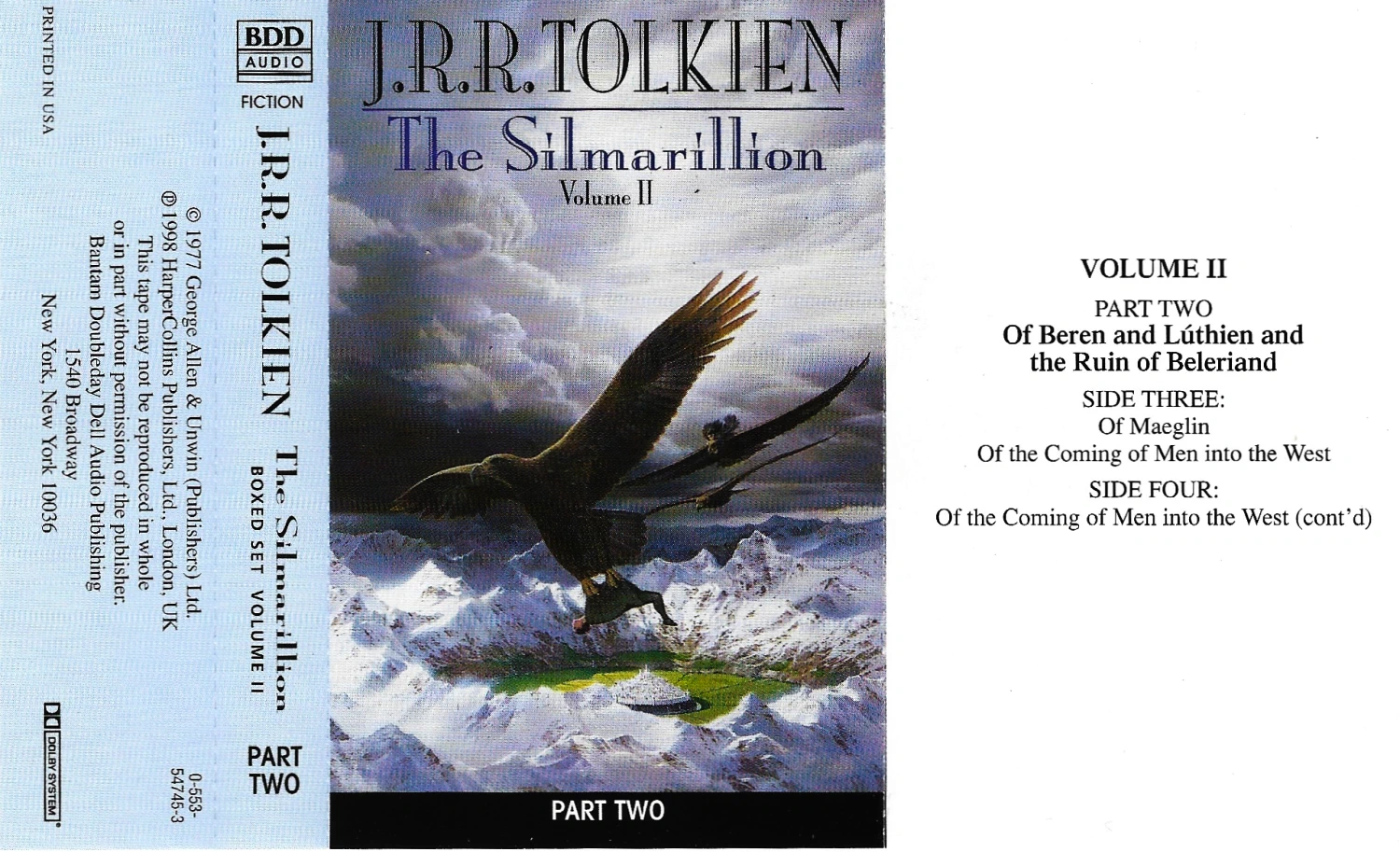 The 1998 recording of The Silmarillion by Martin Shaw was a landmark production that served as the primary English audio version of the text for 25 years. The production was a collaboration between HarperCollins (UK) and Random House Audio/BDD Audio (US). It was first released as a multi-volume set of 12 cassettes that included a brochure and a map of Beleriand and also as a 13 CD box set.