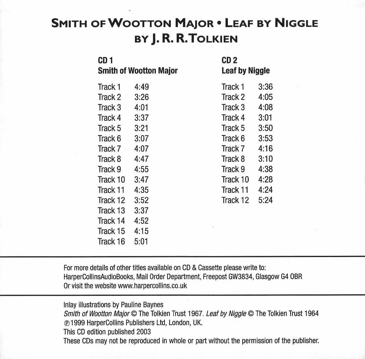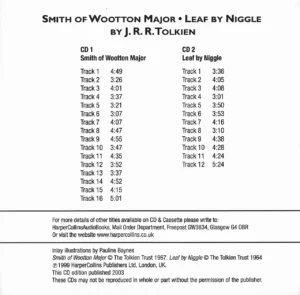 Because Leaf by Niggle is a short story, it was rarely sold alone in the physical era. It has been repackaged multiple times. In the late 1990s and early 2000s, HarperCollins paired Leaf by Niggle with Smith of Wootton Major (also read by Jacobi) to create a standard-length audio product. It then appeared as part of two boxed set collections; The Tolkien Treasury and HarperCollins’ version of Tales from the Perilous Realm. With the rise of digital streaming, HarperCollins decoupled the stories to sell them individually.