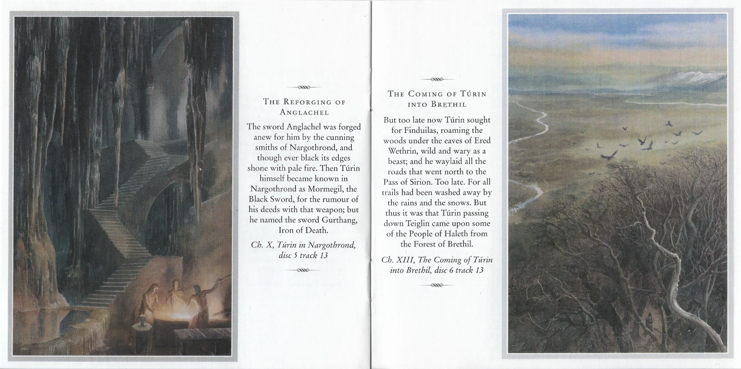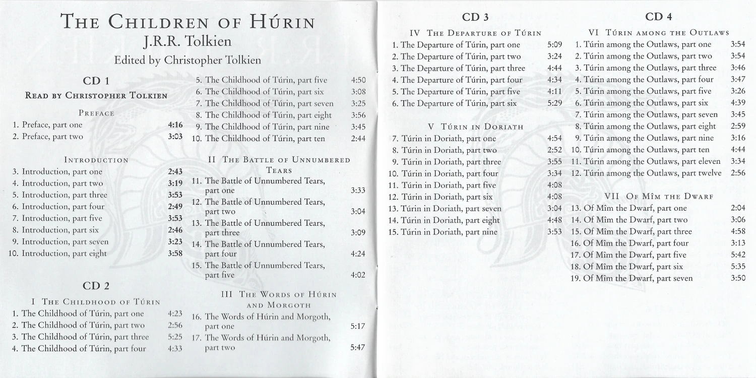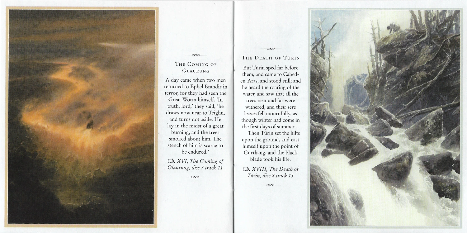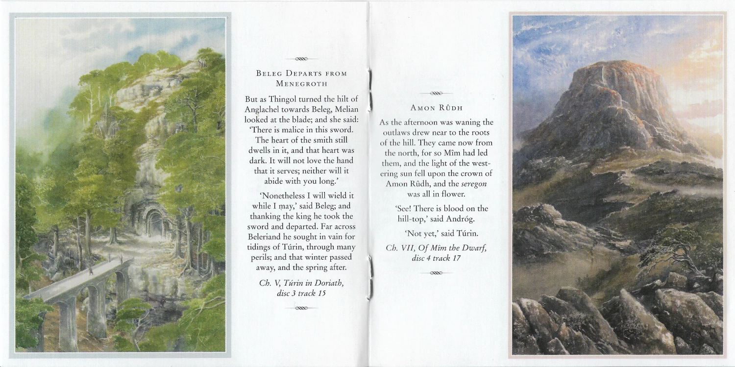 The Preface and Introduction are read by Christopher Tolkien while the text is read by Lee. This recording took only 5 days of studio time. The 8 CD release includes a booklet which has Alan Lee’s drawings from the book and a map.
