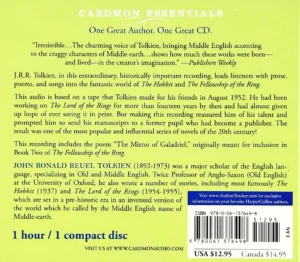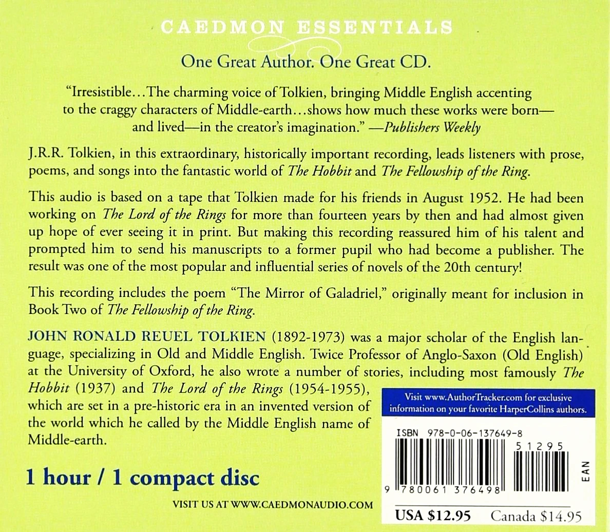 Selected excepts from TC 1477 JRR Tolkien Reads and Sings His The Hobbit and The Fellowship of the Ring. Includes excerpts from The Hobbit and The Fellowship Of The Ring plus the poem The Mirror of Galadriel.