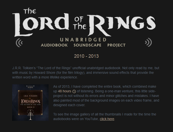 Unofficial and unabridged audiobook soundscape by Phil Dragash, using music written by Howard Shore for the film trilogy, and immersive sound effects throughout. An extremely high quality production.