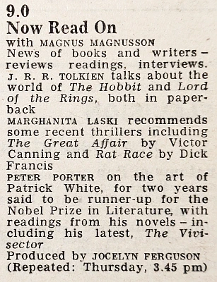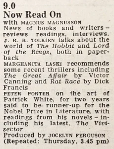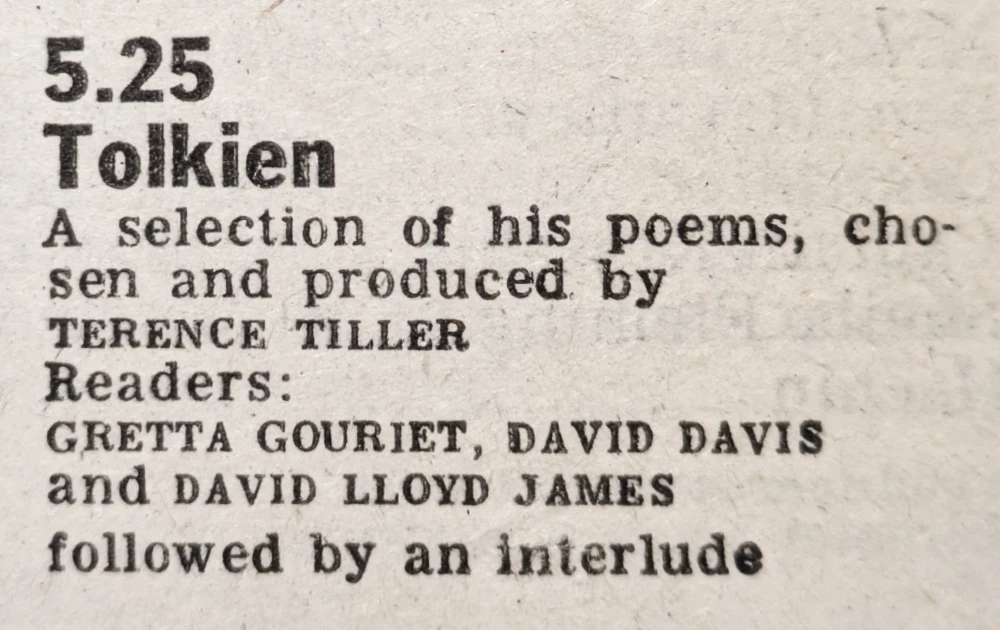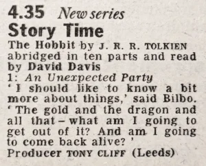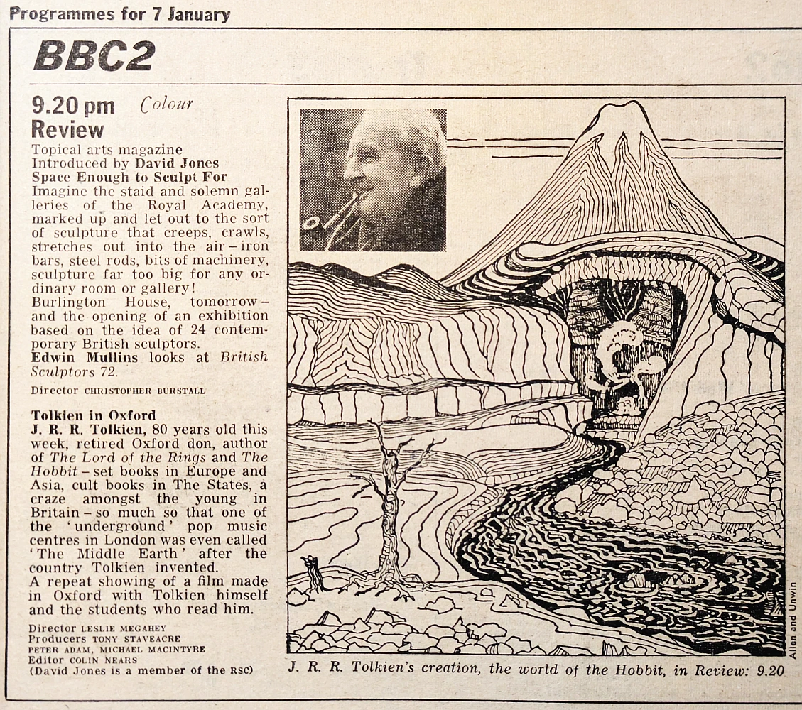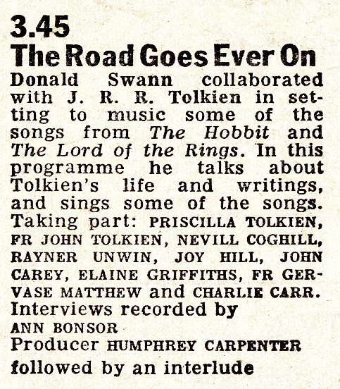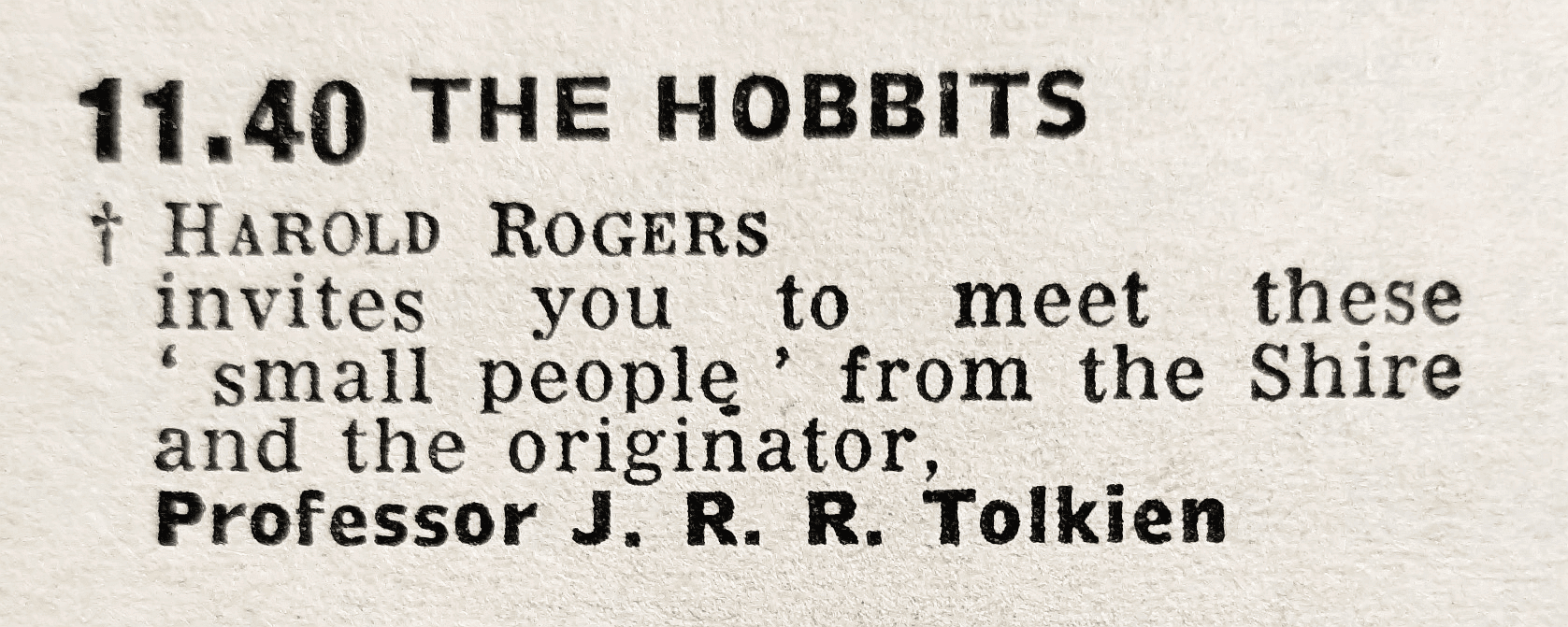 The list given below is sourced from the BBC publication The Radio Times and the text is largely reproduced ‘as was’ when originally printed. It will in time become a complete picture of the BBC’s Tolkien-related broadcasts, both radio and television. There are 3 general categories: